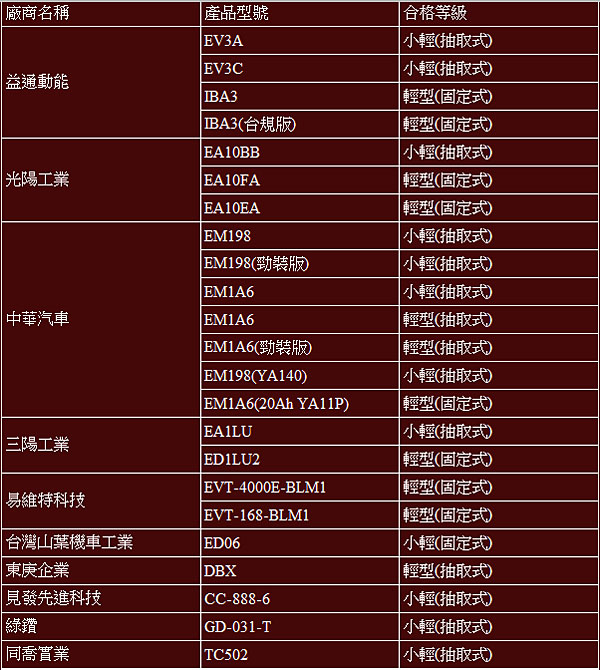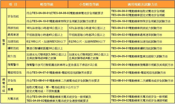 如雨後春筍般冒出的電動機車,相信你我都曾在道路上或店家中見過,但多樣的選擇,在機車行老王賣瓜的思維中,的確很難挑選出合適自身的代步工具;而為了全面提升電動機車的品質與安全性,早在民國98年時經濟部工業局便已制訂「電動機車性能及安全測試規範(Taiwan E-scooter Standard)」,簡稱TES規範,乃是全球第一套針對鋰電池電動機車所製訂之規範,針對整車的安全性能、爬坡性能、最高車速、加速性能、續航性能、耐久性、殘電警示、電磁相容性;針對李電池組的安全性與重量;針對充電系統等三大類別逐項檢測。TES檢測施行至今,共有十個廠商旗下多款車型通過,如下方表格所述。