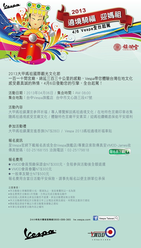 4/6日Vespa將從台中出發遶境騎福迎媽祖體驗在地文化。