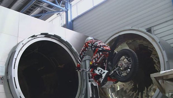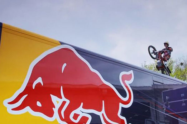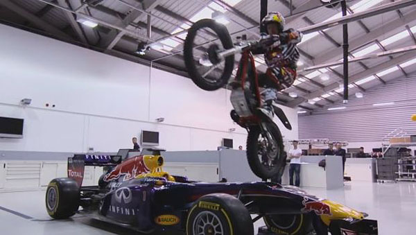 最令人感到刺激的,則是在車庫中Dougie Lampkin騎著他Gas Gas此西班牙品牌的越野機車,以跳躍的方式,跳過了Sebastian Vettel的F1賽車,高超的技術,在輪胎接觸輪胎的方式,沒讓這輛集合高科技與昂貴身價的賽車受到任何損傷,展現了Red Bull車隊的創意外,Dougie Lampkin的高超技巧,更是在驚訝背後的最精采亮點!
