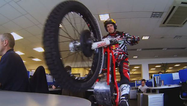 對,你沒聽錯,Dougie Lampkin這老兄很厲害的,用兩輪機車的方式,進入了Infiniti Red Bull位在Milton Keynes的總部,且在雙腳不著地的方式,緩緩的參觀了包含辦公室、餐廳、車庫等,這樣如此「特殊」的方式,Dougie Lampkin怎會有此機會?
