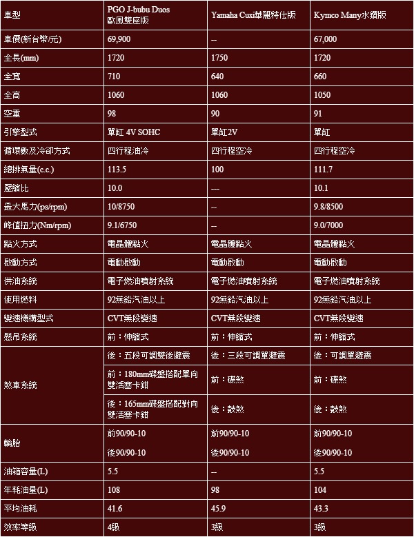 J-bubu Duos歐風雙座版與競爭對手基礎規格表: