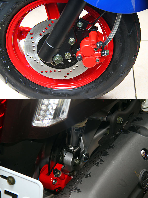 前後大尺寸碟盤與金屬油管,搭配後雙避震,不僅擁有優異的制動力道,也給予更為舒適的騎乘感受。