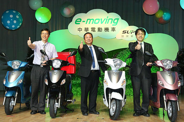 中華汽車劉興臺總經理(中)、經濟部工業局陳鵬詠科長及技術處張明煥科長一同為e-moving Super站台造勢。