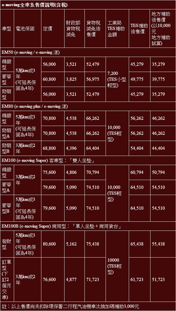 計算基準:以e-moving載重75kg,5年行駛平整道路3萬公里 (每日20km / 每月25日),補助條件如表中註明(未列入二行程油車汰換加碼補助部份)。