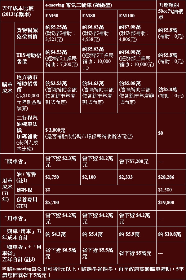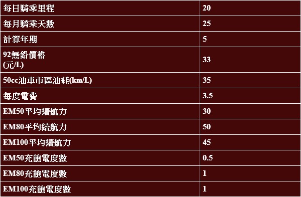 註1:50cc市區油耗約35km/L,92無鉛汽油33元/L計。EM50充飽電0.5度以平均續航力30km試算;EM80充飽電1度以平均續航力50km試算;EM100充飽電1度以平均續航力45km試算;電價以3.5元/度計。