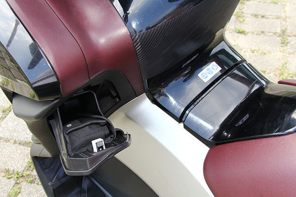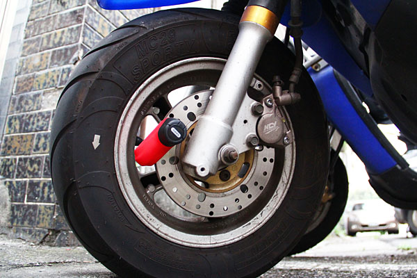 使用車型為Honda Integra紅牌的大型速克達車型,相較之下此碟煞鎖十分迷你,也展現其不佔空間的優勢。