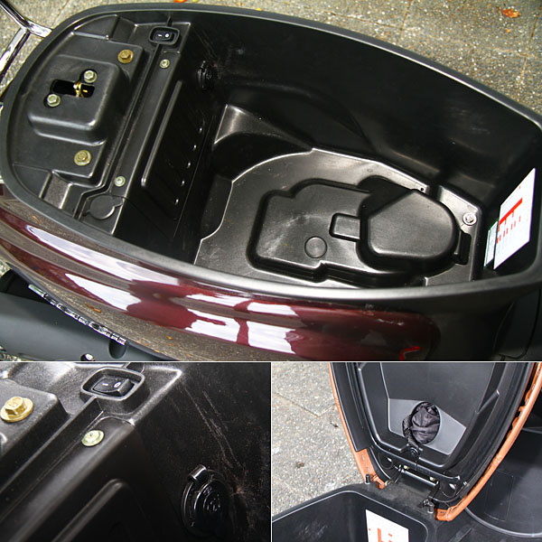 坐墊下方置物空間與J-BuBu車系相同,且多了坐墊防塵套,此外也有電源插座與二次斷電防盜鎖。