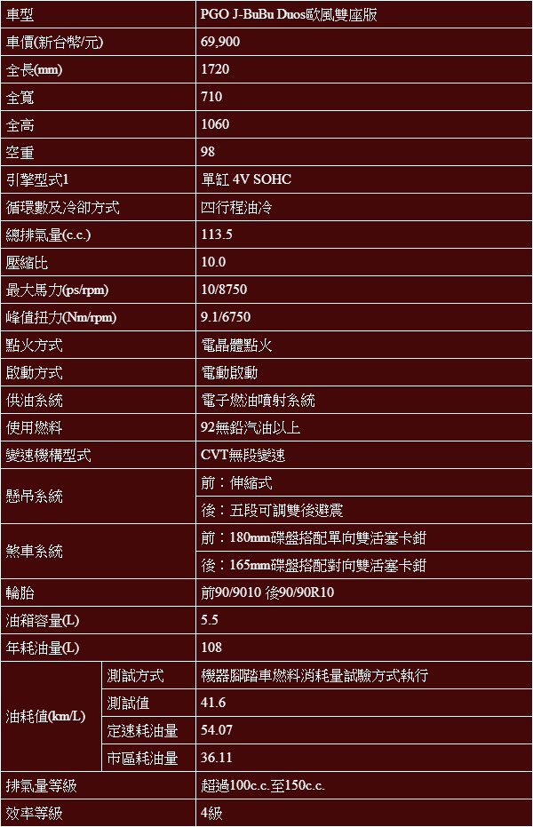 撇開因人而異的審美觀,新台幣69,900萬元的J-BuBu Duos歐風雙座版,無論就實際試騎的體驗,或是紙上談兵的配備比拼,J-BuBu Duos歐風雙座版的確都承襲了J-BuBu車系優異表現,較對手更出色的C/P值,也反應在近年來J-BuBu車系扶搖直上、幾乎成為品牌當紅炸子雞的銷售數字上;相信的J-BuBu Duos歐風雙座版的再次問世,更會直接反應在車系再次成長的銷售數字上。