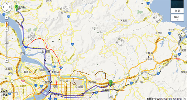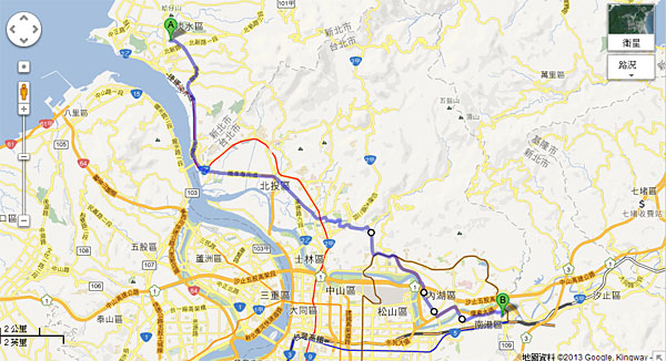 擷取google map路徑規劃圖,此為由淡水新市鎮出發至南港科學園區的汽車行駛路線。