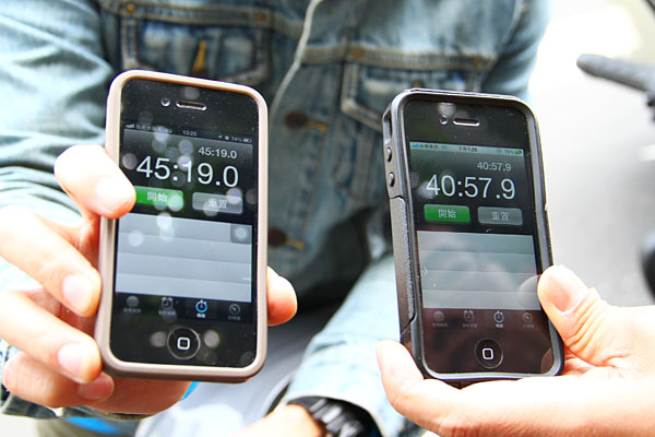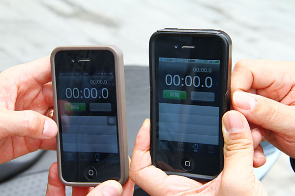 將同款的iPhone 4S碼表歸零,同時啟動後出發!