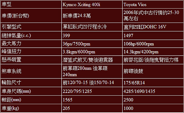 Kymco Xciting 400i與Toyota Vios 1.5L基本規格表