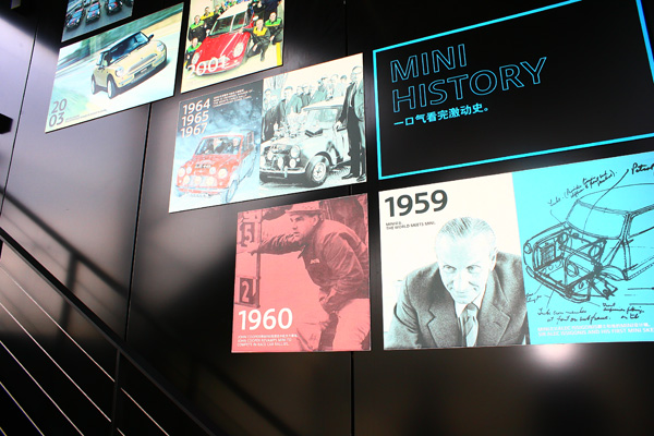 「Mini品牌體驗中心」的一樓是一個頗富象徵意味的停車格,一輛亮藍色的Paceman恰巧停駐於此,引人躍躍欲試的悸動。延著後方設計簡潔的樓梯上二樓,樓梯迴廊牆面從歷史開始講起,始自1959年發表的Austin Mini宛如一本活字典,並以矯健的身手從此活躍於賽場之上,直至BMW將之納入旗下仍以此自豪著,而Mini也利用這樣令人熱血沸騰的氛圍,導引參觀車迷進入二樓平面展區。