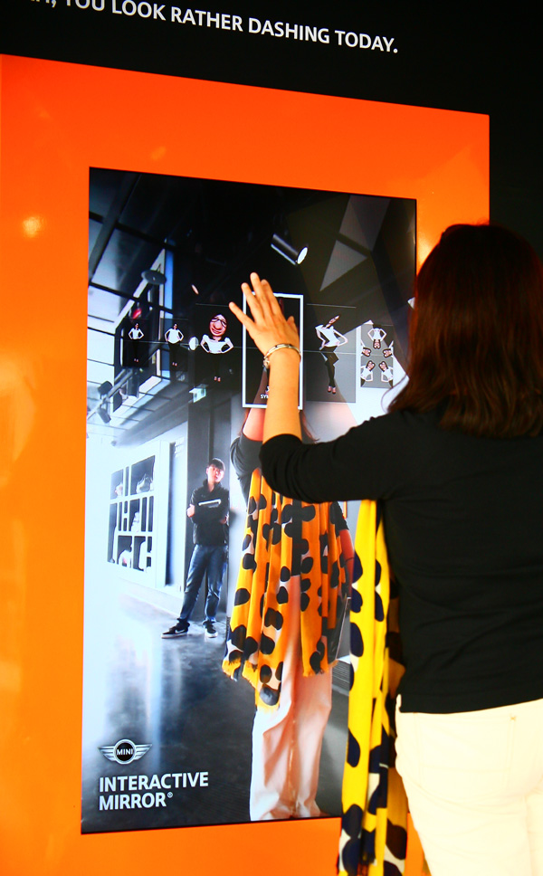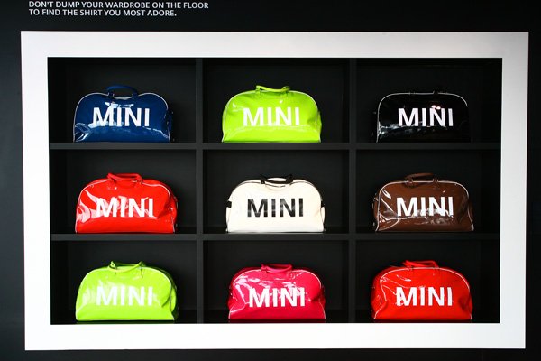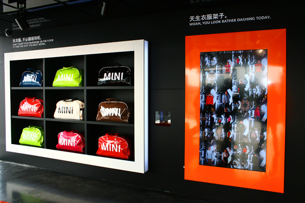 走進中心二樓,裡頭陳列的雖然還不是最新的大改款Mini,但透過不同車款展示,不僅讓人得以近距離領略車款精髓,同時也能夠透過人員產品解說更加同理品牌魅力所在。再往上走則開始進入Mini背後所象徵的潮流與個性化思維,迴廊上〝不為個人代言,只為個性代言〞的字句,明白點出這個堪稱車界潮牌之所以讓人趨之若鶩的原因。三樓,是品牌精品服飾所在地,Mini人不只開得是Mini,也想裝扮得如同Mini般精緻、率性又時尚,在此他們以五彩繽紛的包包、衣服、褲子乃至小配件,提供Mini迷一個讓全身煥然一新的方案,而一旁有趣的〝人衣互動介面〞,更可透過動作感應在螢幕前換上不同的衣褲或配件,好看看預期的穿搭是否與自己未來的愛車相襯。最頂樓則為吧檯區域,透過最高樓層的好視野,不僅將外頭風光一覽無遺,如果在此一杯Mojito餟飲,更能透過酒精領略Mini無國界大魅力。