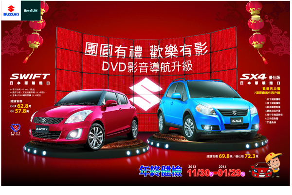 近年來銷售量穩定成長的Subaru,也為旗下的產品推出好禮2選1或是低利率優惠方案,包括Forester與XV 2.0i都贈送影音系統與低利率分期優惠專案,其他Impreza、BRZ、Legacy、Outback與WRX STi等車款也提供相對應的低利率分期措施。至於同屬日系進口品牌的Suzuki則是為Swift與SX4等車系推出加贈DVD影音系統的方案,並且推出加裝空力套件與DVD影音系統的SX4優仕版特式車。