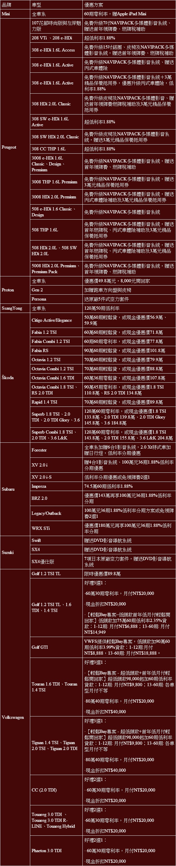 相較於花招百出的國產品牌,進口品牌的促銷方案相對樸實,Peugeot打出了影音升級方案,除了208車系、308 SW e-HDi 1.6L Active與308 CC THP 1.6L僅開出1.88%低利率貸款方案外,其餘全車系皆享有升級NAVIPACK多媒體影音系統的優惠措施,部分車款還加贈燃料稅與領牌費補助,或是3萬元精品保養抵用券等。近來動作頻頻的Škoda則是延續先前低利率/零利率貸款方案與現金折扣2選1的優惠措施,與同屬太古汽車代理的Volkswagen品牌相同。