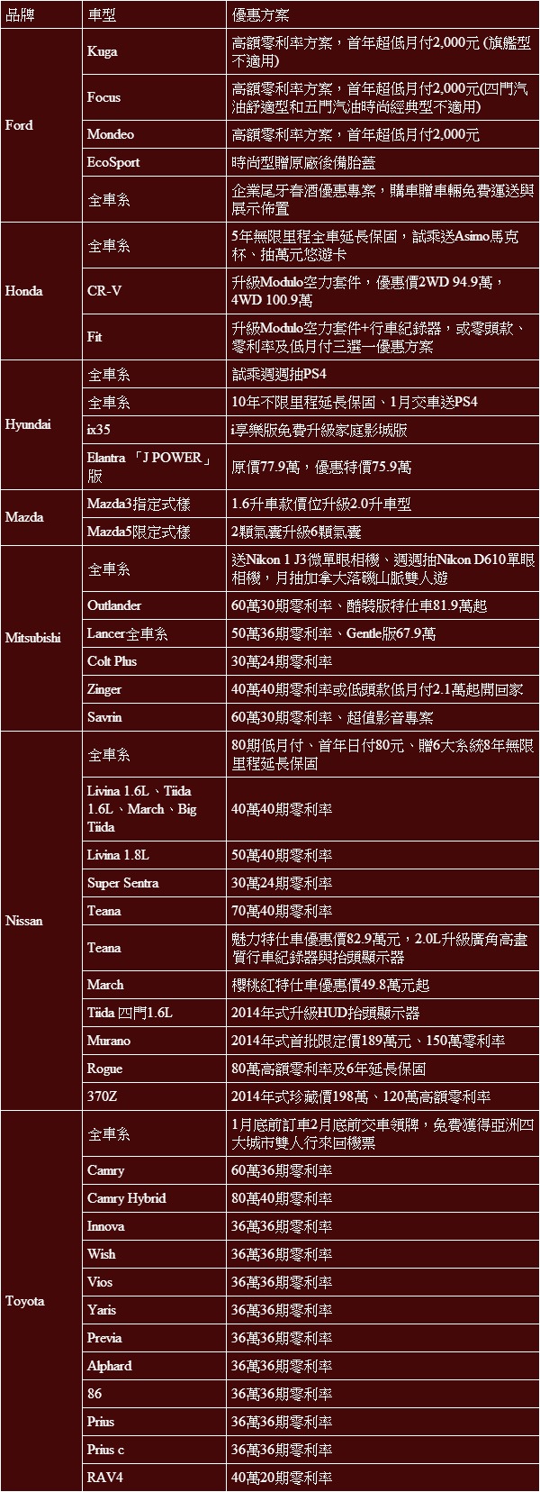 國產品牌部分,大多數車廠都延續了車展前的優惠措施,如Toyota推出的1月訂車、2月底前交車送亞洲4大城市 (首爾、琉球、香港、廈門) 雙人行來回機票,Mitsubishi購車送微單眼相機、週週抽專業單眼相機、月抽加拿大洛磯山脈雙人遊,Mazda的免費升級方案,以及Hyundai延長保固方案、買車及贈Sony PS4遊樂器等,都是延續2013年底的銷售專案。透過贈品與車輛的免費升級,讓消費者即使沒有更進一步的車價折扣,也能有感受惠。
