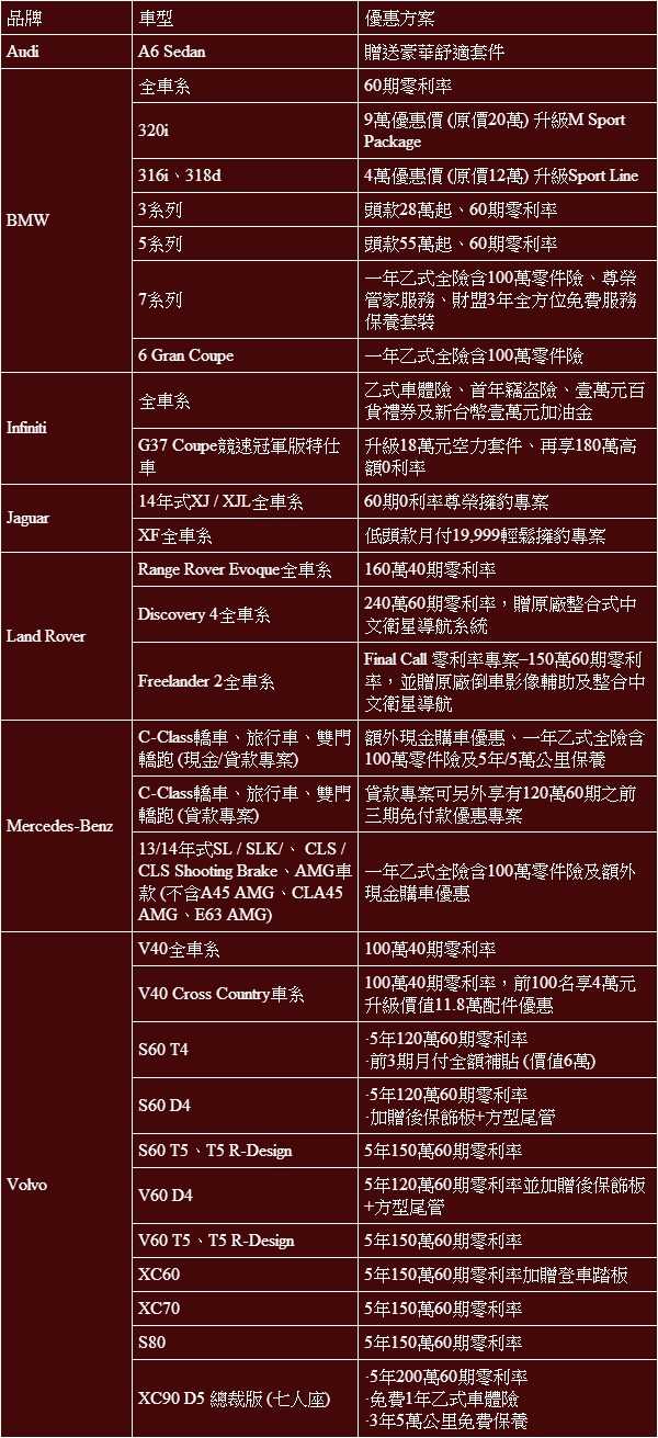進口豪華品牌所推出的優惠方案,則多數以零利率的分期優惠為主,包括BMW、Infiniti G37 Coupe、Jaguar XJ、Land Rover與Volvo等品牌都有推出各車系相對應的零利率分期方案。而Audi則是針對A6 Sedan車系推出贈送豪華舒適套件的優惠措施,吸引對於乘坐舒適有更多要求的消費者。Mercedes-Benz就13/14年式SL / SLK/、 CLS / CLS Shooting Brake推出一年乙式全險含100萬零件險及額外現金購車優惠,以及C-Class車系提供額外現金購車優惠、一年乙式全險含100萬零件險及5年/5萬公里保養與120萬60期之前三期免付款優惠專案兩種不同的優惠措施,期望在年前購車的消費者不妨前往各展示中心洽詢。