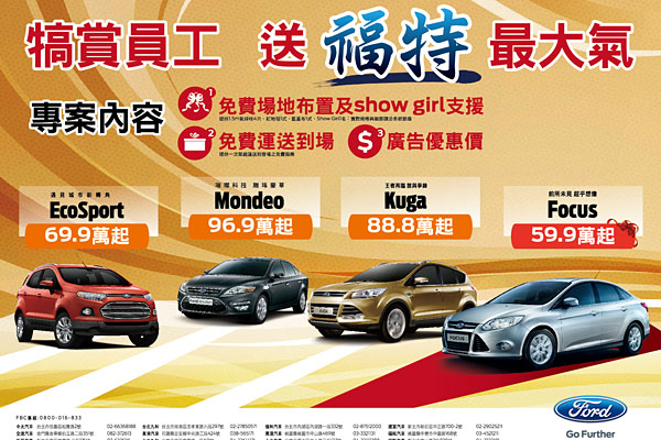 除此之外,Ford除了一般的零利率與低月付方案外,針對年前的購車潮,另外推出的企業尾牙春酒購車優惠方案,便是針對農曆年前的尾牙與開春後的春酒活動。在2月底前,只要符合專案資格的企業購買Ford旗下的車款作為尾牙或春酒活動的摸彩禮,不僅可以享有專案購車駕,還贈送活動當日免費運車與會場車輛展示布置。雖然不是針對一般消費者,卻也是一種別出心裁的促銷優惠。