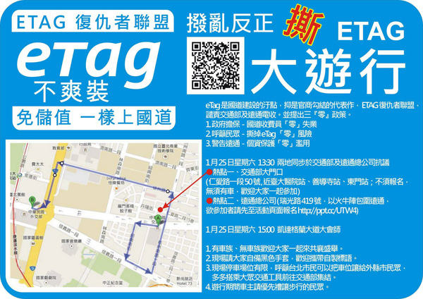 1/25的反eTag大遊行,號召許多對於遠通電收種種作為不滿的用路人集結抗議。