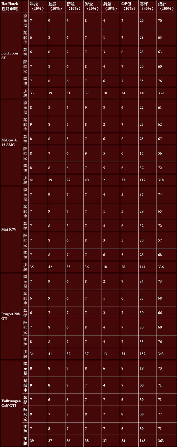 其中總分最低的A 45 AMG為318分,這輛在咱們試車生涯所試過最快的鋼砲,在科技、安全、銷量與C/P值部分其實都獲得了高分,不過因著不夠出色的質感以及過度毛躁的動態反應,卻在主觀喜好部分吃了悶虧。而Focus ST與Mini JCW總分則相當接近,僅有C/P值部分Focus ST大勝Mini JCW,而其他包括科技、動態、節能與主觀喜好則換成Mini小贏Focus。