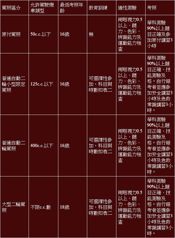 表一:日本機車駕照區分與考照相關條件表。
