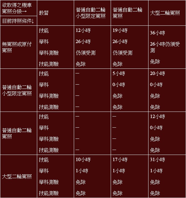 表二:日本機車教育訓練時數及可免除之測驗。