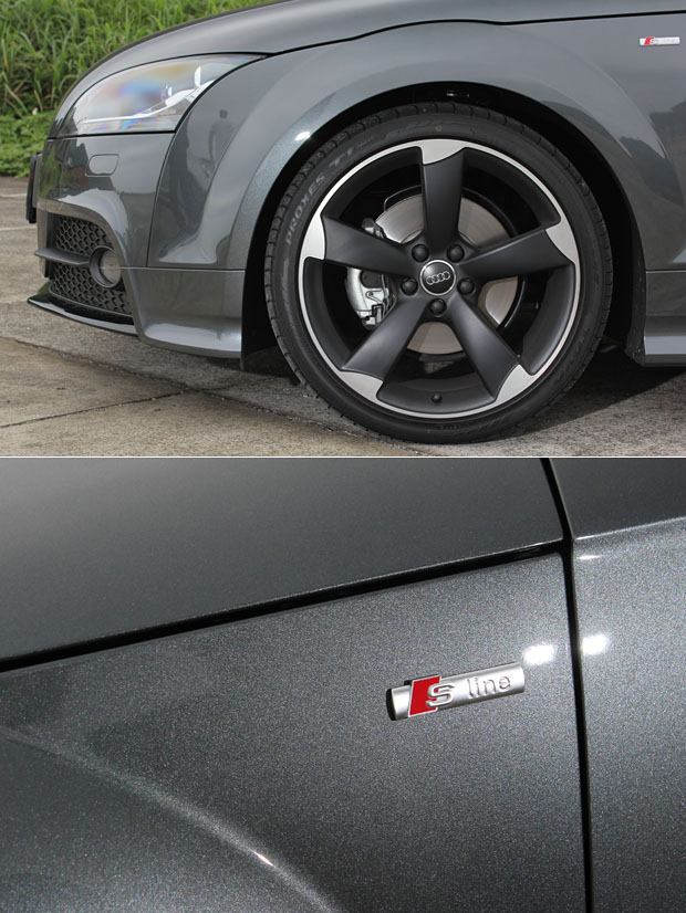 輪圈也換上了與TT RS相同的Audi Exclusive黑色五輻「Rotor」造型鋁圈,尺寸為9Jx19;前葉子板上也清楚寫明了S line的套件名稱。