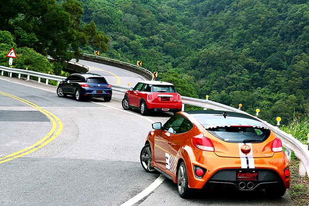 跨界Fun Cars?至少筆者是這麼定調如今天文中主角Hyundai Veloster、Mini Cooper與Volkswagen Scirocco的,何解?先從帶出這個話題的Veloster談起好了,這款Hyundai用以接替Coupe這款曾經膾炙人口小跑車的新產品,外觀上一反兩代前輩的滑順低扁,反倒以更重視車室空間的類掀背造型示人,還有更特別的,就因為講究後排實用性,Veloster還擁有與現行Mini Clubman類似,乘客側(在臺灣這種左駕地區即右手邊)兩門、駕駛側單門的獨特「四門」設計(Clubman則因委們也採雙門對開設計,因此總計五門),雖然Hyundai總期許其為小跑車,但我們卻因其跨界屬性,只能定義這是款位於跑車與掀背車間的跨界新物種。