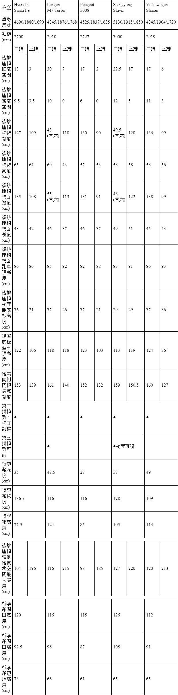 Santa Fe、M7 Turbo、5008、Stavic、Sharan空間比較表: