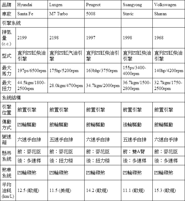 以標準七人座的MPV車型而論,其實Hyundai Santa Fe與Peugeot 5008都不算是標準格局的代表,但考量其納入百萬售價的範圍,仍值得於此次評比中高調現身。的確,以308車系底盤衍生的5008車型,正確而論,乃屬於與你我熟悉的Toyota Wish相同身型,嚴格而論應屬於「轎式休旅車款」,因此乘坐機能,屬於5+2的設定,所以在乘坐表現上,自然不如對手出色。雖然於此面向遭到扣分,但無庸置疑的,近年來Peugeot於車輛設計上的精緻與高級化,充分反映在5008的駕乘質感上,從動力充沛、源源不絕的2.0升柴油引擎開始,展現Peugeot多年來於柴油領域的領導地位外,更完美延續於308上便廣受好評的底盤調效,操控身手堪稱當天最為俐落的代表,饒富樂趣的演出,無從挑剔。
