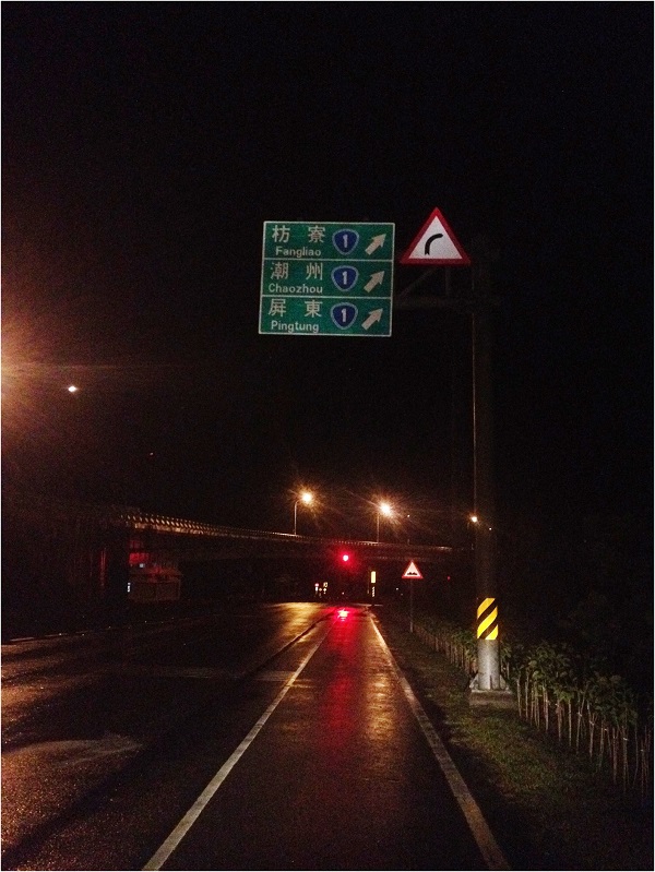 其實我也忘了在南迴騎了多久,當時一心只想離開那山路,當山路已慢慢拉直看到臺1路牌時,我的心再度亢奮了起來,雖然很想左轉去墾丁,但想到明日仍然天雨我就只好續往高雄出發。本來想在台9線的終點標示拍一張,不過穿著雨衣背著包包的我經過南迴的洗禮後,真的是懶到連相機都拿不出來了。我們於臺1線加緊了速度於水底寮吃完晚餐然後再循臺17往高雄前進,經過一大段的騎乘後,終於要右轉高屏大橋了,是的!我們要進入大高雄的邊緣了。上了高屏大橋其道中間後,一種很對比的情景出現在眼前,身後的屏東因天雨加上微微路燈感覺冷清黯淡,但眼前那端因為林園工業區內的廠房不斷運轉而燈火通明,頗具未來感。我不敢冒險於橋中央停留拍攝那映入眼前的燈火景象,但是當時心中看到遠方那麼多燈光時卻是欣喜不已,這表示我又跨越了一個縣市,離我今晚的目的地又再更近了些。