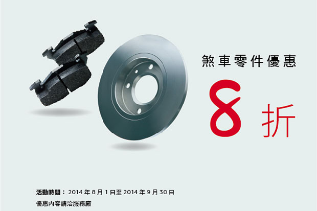 Citroen總代理寶嘉聯合自8月1日起至9月30日止推出2014年Citroen Services原廠零件優惠活動第五波精選 ─ 煞車零件特惠,車主們於活動期間內回廠即可享煞車片零件8折優惠。