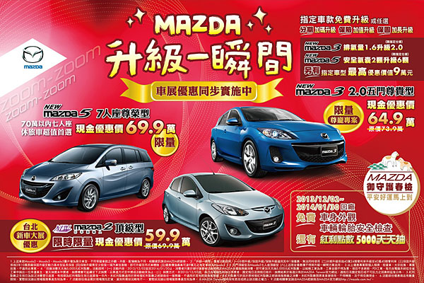 為配合2014台北新車大展,Mazda宣布從開展日起,限時限量推出車展期間購車優惠活動!