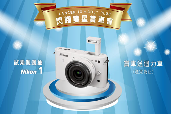 歡慶新車上市,Mitsubishi熱銷車款Lancer iO、Colt Plus 4月聯手推出「閃耀雙星賞車會」活動,來店賞車不僅送你精緻迴力車,配合試乘活動,還將加碼週週抽Nikon 1,讓你開新車、拍新機!此外,為回饋RV車車主,4月將延長「三菱RV 五星級玩咖」活動。